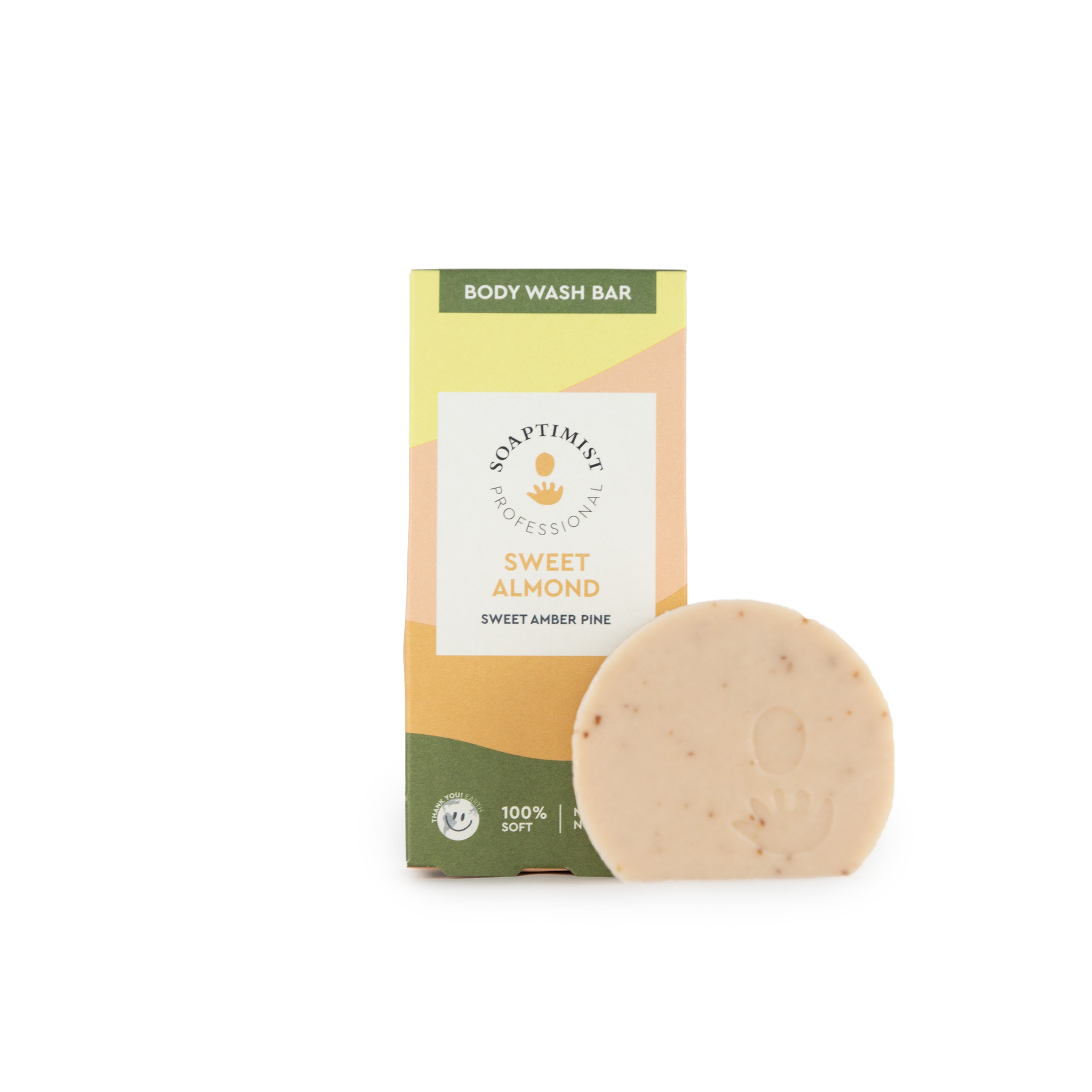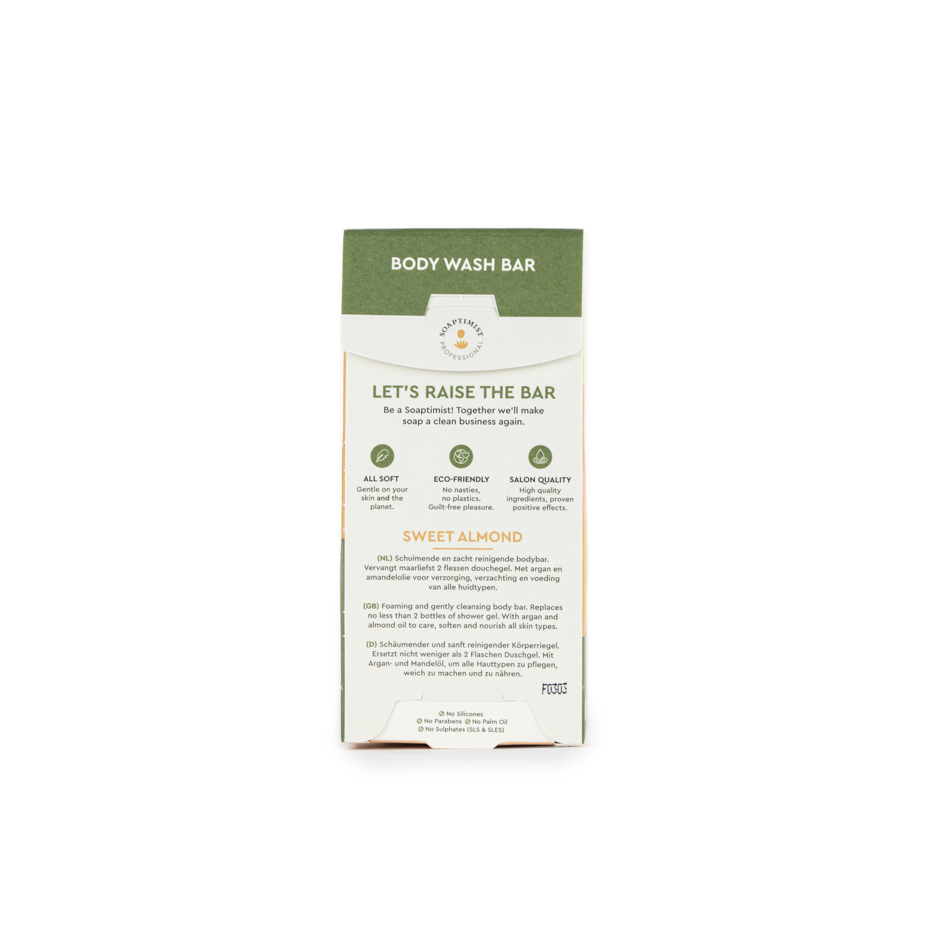 Schuimende en zachte reinigende bodybar. Met argan en amandelolie voor verzorging, verzachting en voeding van alle huidtypen. Geniet van onze favoriete rustgevende Soaptimist geur van amber en amandel. Onze body bars zijn palmolie vrij. Zacht voor jou én zacht voor de planeet. 1 bar vervangt tenminste 2 flessen douchegel.