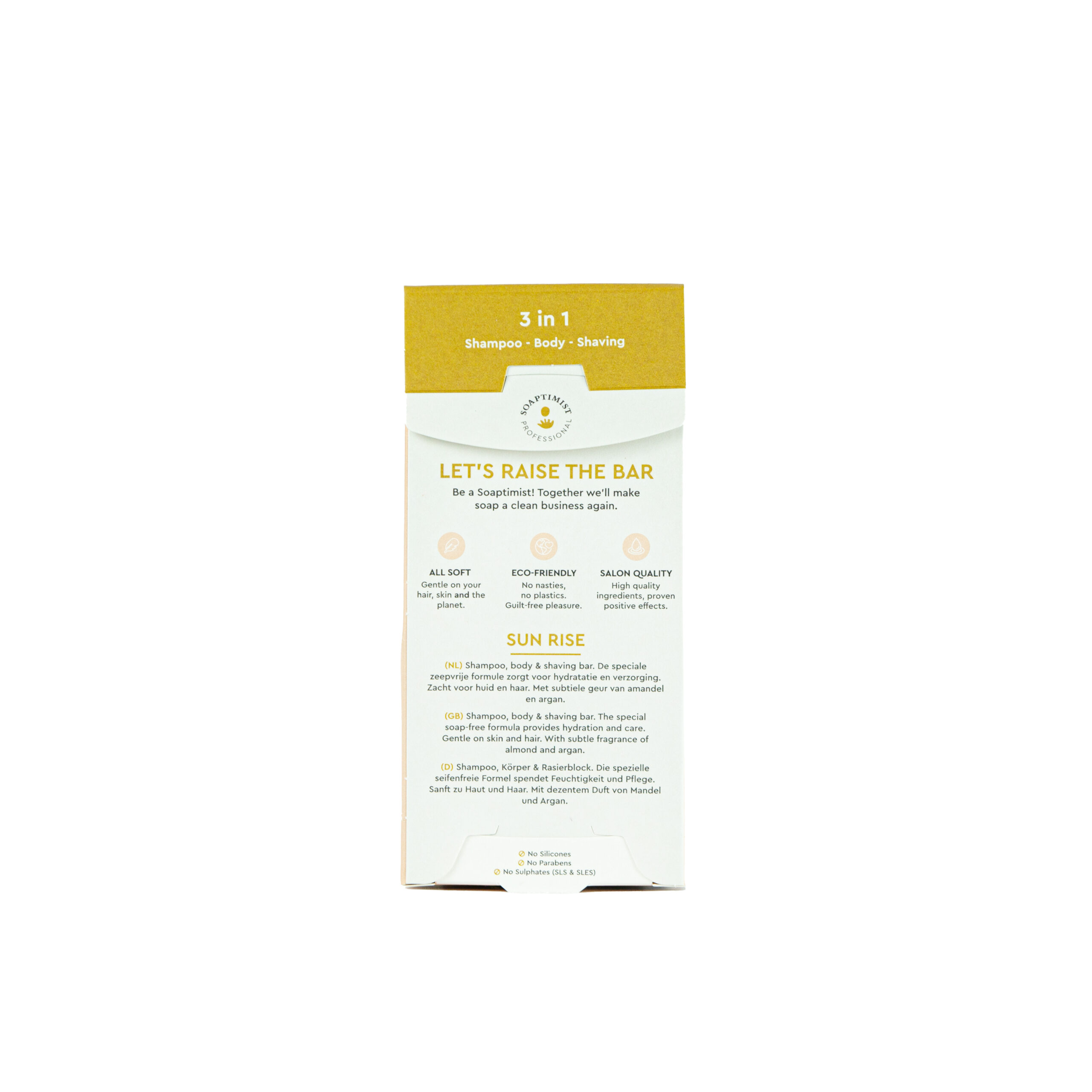 Stop met zoeken—de Sun Rise 3 in 1 bar doet alles. Of je nu wilt scheren, je haar wassen, of je lichaam wassen, deze bar biedt het allemaal. Met de zeepvrije formule en zomerse geur van Amber & Amandel, zorgt deze bar voor zijdezachte verzorging van top tot teen. Schuimt heerlijk. Bovendien bevat deze bar geen SLS, siliconen, parabenen, of zeep, waardoor je kunt genieten van natuurlijke en verantwoorde verzorging. Eén bar, drie functies—meer heb je niet nodig.